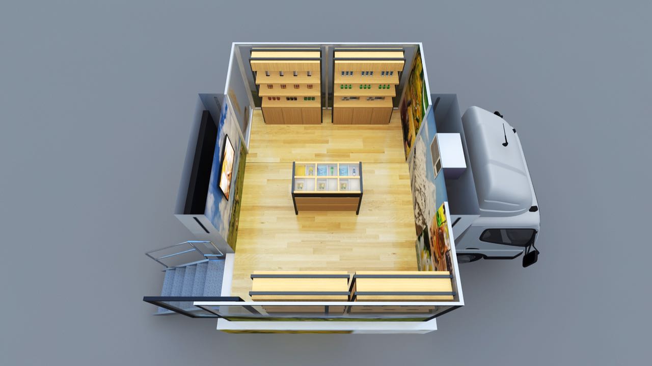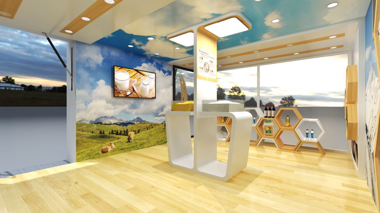 以路演大篷車為載體,打造移動的品牌體驗店。獨特創新的智能雙擴容車廂結構,展開后兩側為全透視玻璃櫥窗,達到360°品牌展示效果。車內配備照明、空調等,打造16平方米舒適的產品展示與售賣空間。整車靈活機動,可深入社區、廣場、商業街等,輕松打造24小時營業生活便利店。