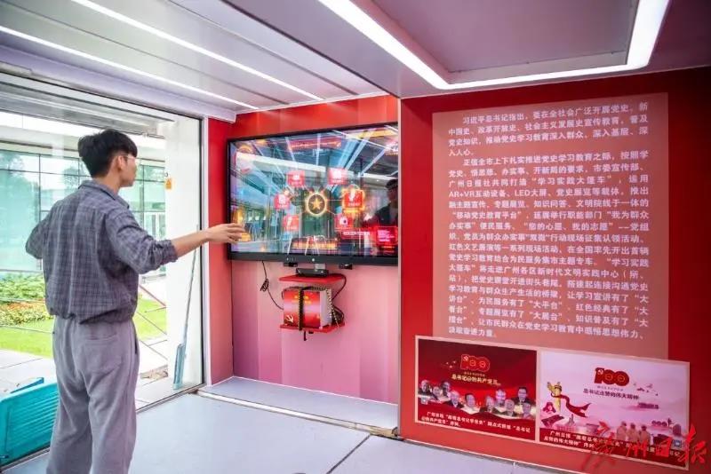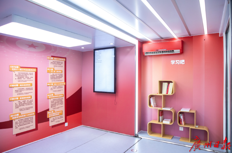 學習實踐大篷車還大有乾坤。車內搭載LED屏幕、音響設備、立式屏幕一體機、AR+VR互動設備,可承載黨史宣講、工匠競技、紅色展演和志愿服務的綜合一站式黨群互動傳播與服務。一輛大篷車,把學黨史、悟思想、辦實事、開新局的5個“臺”開進廣州街頭巷尾。