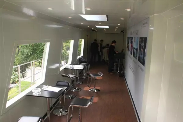 車廂里設(shè)置車輛展示區(qū)、品牌展示區(qū)、洽談區(qū)、舞臺(tái)區(qū)及休閑娛樂(lè)區(qū)等功能分區(qū),空間布局雅致舒適,為您創(chuàng)造舒適與愜意的賞車與洽談空間。