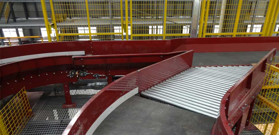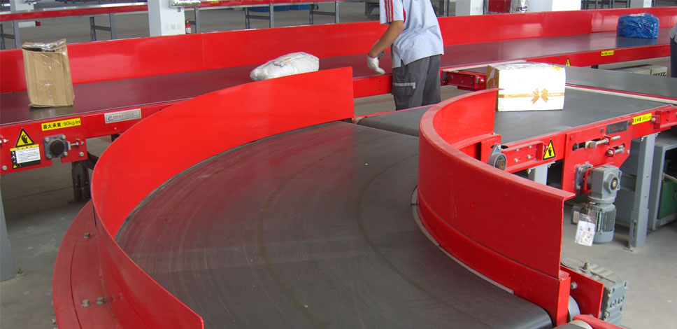 轉彎膠帶機用于沿曲線流輸送包件貨物。針對不同的應用,使用不同的角度和皮帶寬度構建不同的物流曲線。通常這種裝置用于連接不同種類輸送機的輸送系統中,實現包件貨物某些流動方向。
