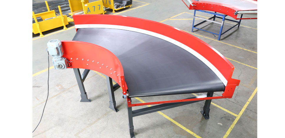 轉彎膠帶輸送機可實現貨物改變輸送方向進行輸送,與之相接的直線膠帶機可平滑的連接。